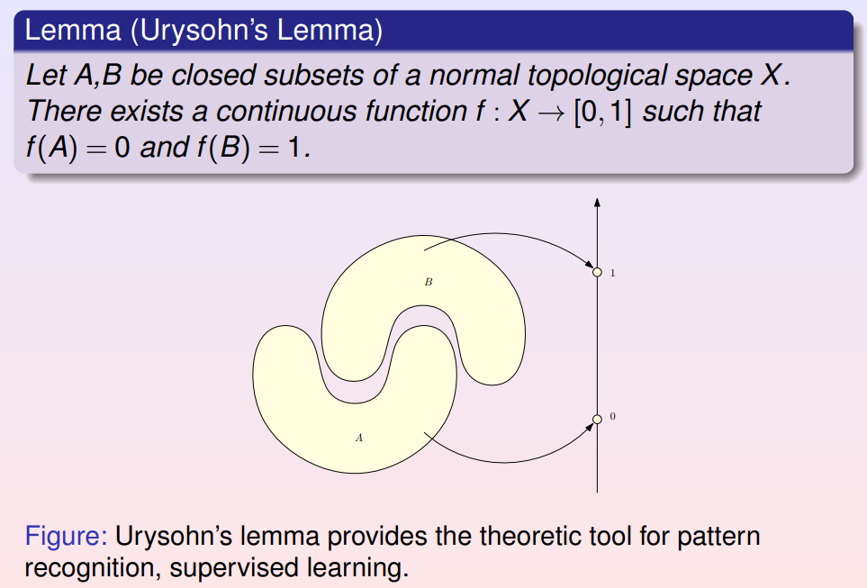我们进行模式识别的时候,每一类数据样本其实都是高维空间中的点云,不同类样本是不同的团簇,两个团簇可以用两个闭集覆盖。上述Urysohn定理表明了所需识别映射的存在性:即在一般的拓扑空间里肯定能找到一个连续映射,把第一个闭集映射成0,把第二个闭集映射成1。对于分类判别器而言,算法的核心就是求解这个映射。