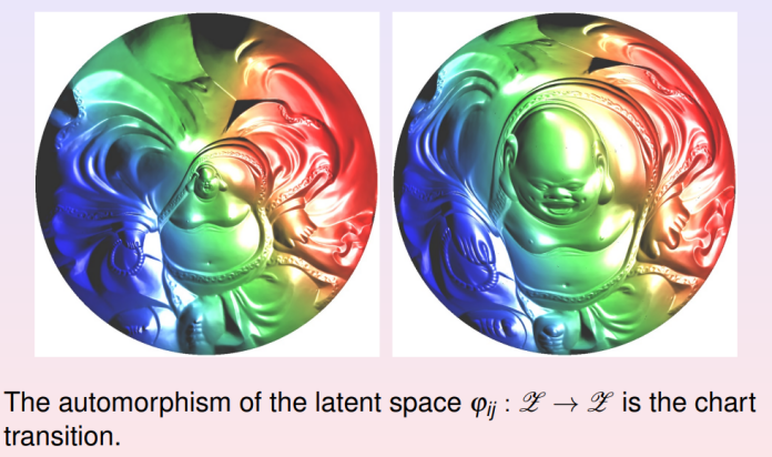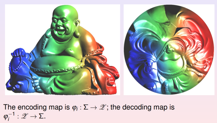 降维的过程被称为编码,逆过程被称为解码。这里我们显示了两种编码映射,它们都将弥勒佛曲面映到平面单位圆盘上。第一种是基于黎曼映照的保角变换,第二种是基于最优传输的保面元映射。