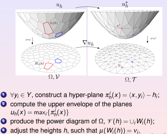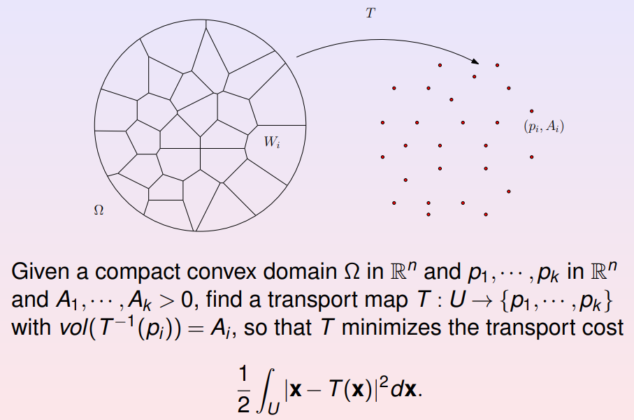 假设源概率分布为单位圆盘内的勒贝格测度,目标概率分布为离散的分布。求解最优传输映射等价于对单位圆盘进行胞腔分解,每个胞腔映射到一个目标采样点,使得胞腔的面积等于这个采样点对应的权重。我们在所有这样的胞腔分解之寻找总传输代价最少者。根据Brenier定理,这个半离散最优传输映射应该等于某个凸函数的梯度映射。