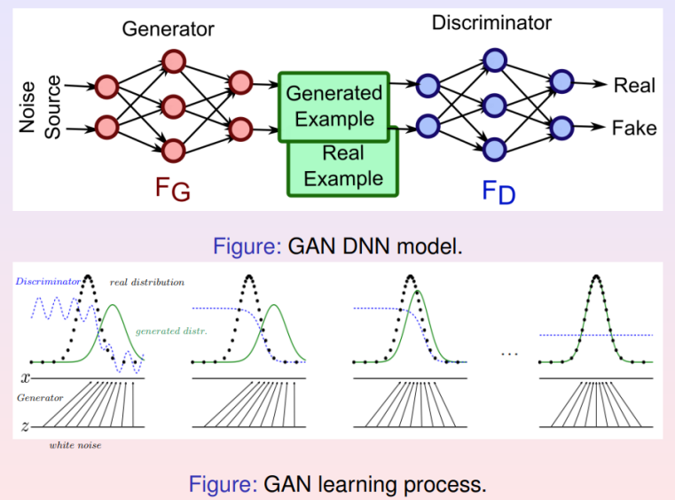 生成器Generator生成虚假的数据分布,判别器Discriminator要识别分布是真是假。那么用数学语言就是说,我们在特征空间有个白噪声分布,生成器将特征空间的白噪声分布变换成数据流形上的生成分布。图中数据流形上的生成分布是绿色曲线,数据流形上的真实分布是虚线。判别器判别两个分布的相异程度,生成器优化生成分布,使之尽量接近真实分布。两者相互竞争,最终系统达到平衡。