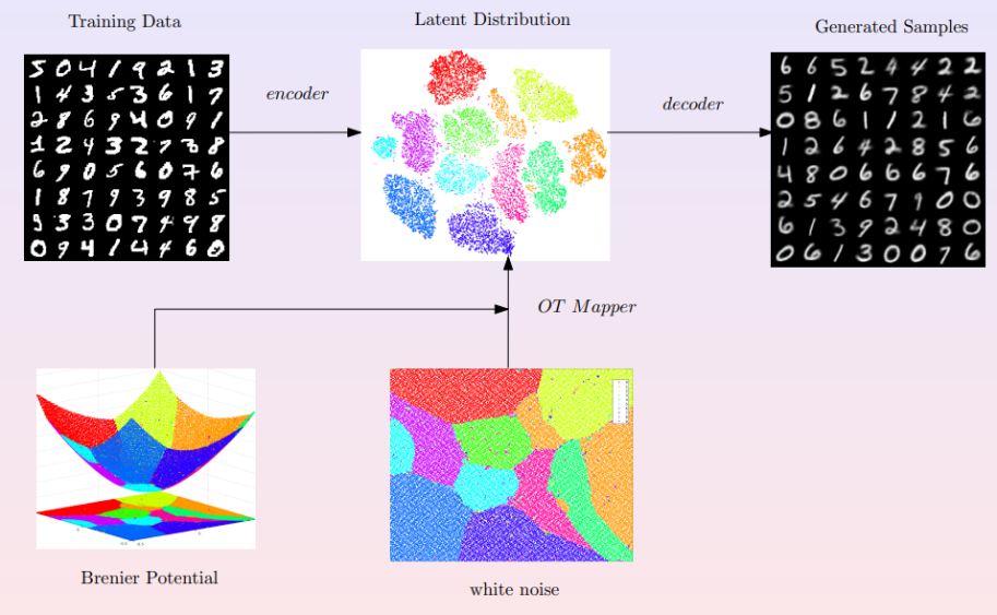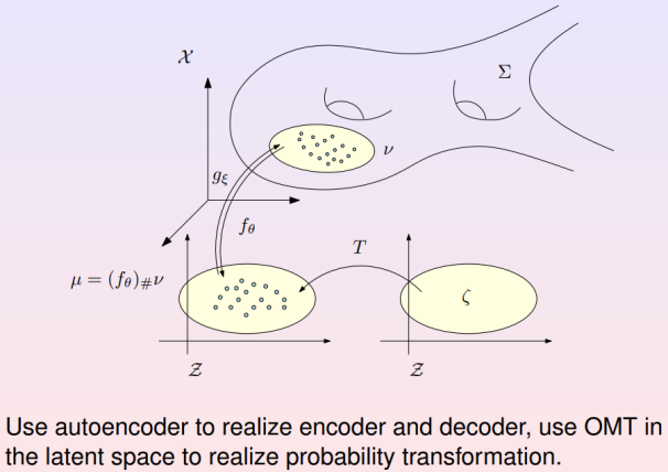 我们知道有很多的生成模型,这些模型的框架如图所示,上面一行显示了学习流形结构的过程,下面一行是学习概率分布的过程。在上行中,编码映射将手写体数字流形映射到特征空间,将流形上的概率分布映射到隐空间上的概率分布;解码映射将隐空间映回数据流形。在下行中,最优传输映射将长方形内的均匀分布映射到隐空间中的数据分布,这里最优传输映射是某一凸函数的梯度映射,此凸函数被称为是Brenier势能。