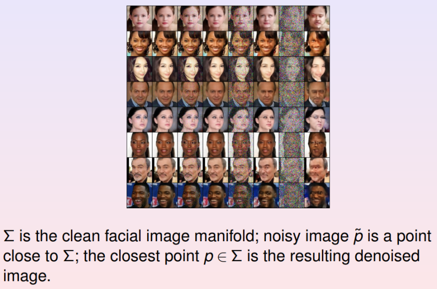 假如我们想对图像进行去噪处理。如果用经典方法,第一步我们需要进行傅里叶分解将图像变换到频域,然后进行低通频滤波,滤除高频噪声,最后进行傅里叶逆变换。这种方法是普适的,而深度学习则是另一种思路。我们先用干净的图像训练出数据流形。带有噪音的图像被视为数据流形附近的点。我们将其投影到流形上,则流形上的垂足就是去除噪音的图像。如此我们就实现了图像的去噪处理,下面是相关的实验结果。