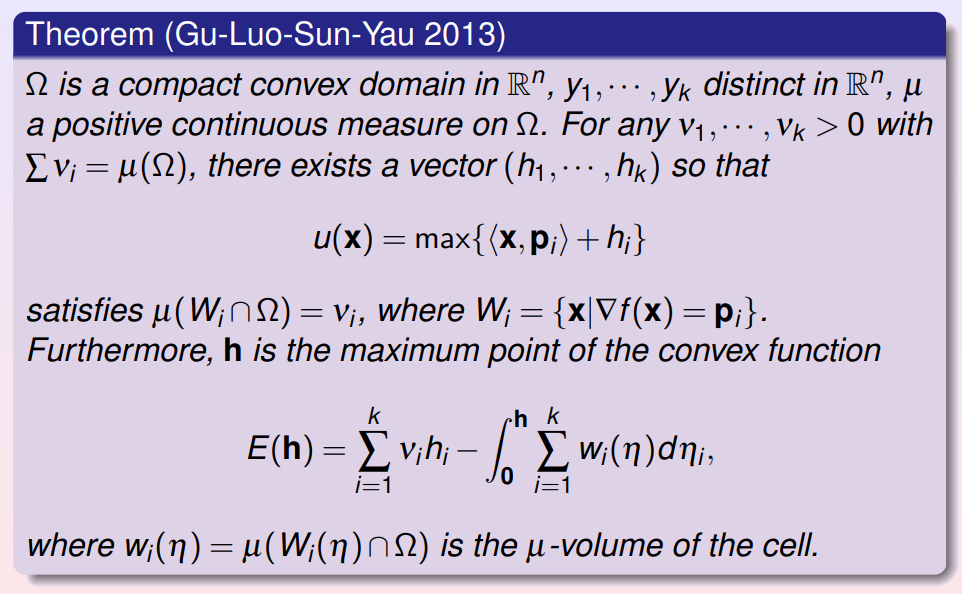 2013年,在丘成桐先生的代领下,我们用几何变分法给出Alexandrov定理的一个构造性证明。Alexandrov定理和Brenier定理是等价的,这给出了最优传输与微分几何的桥梁。