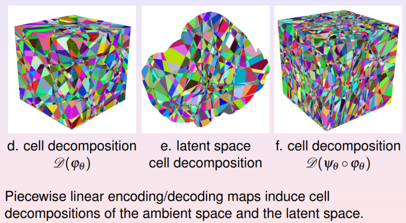 这里我们显示输入、输出空间和隐空间的胞腔分解,编码映射和解码映射在相应的胞腔间是线性映射,因而整体是分片线性映射。