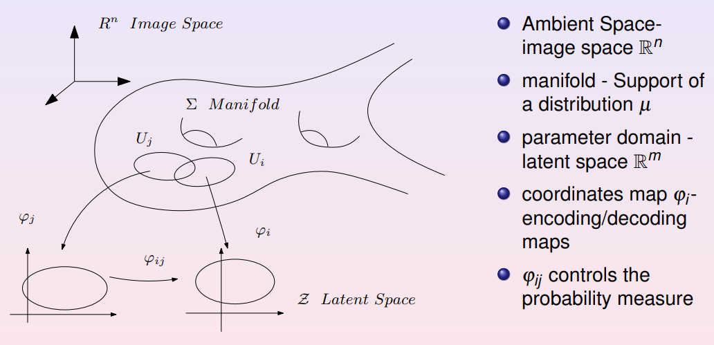 我们可以用数学语言来描述,背景空间是一个图像空间,图像空间的维数就等于每张图像上像素的个数。某一自然概念对应的数据集就是图像空间中的一个点云,这个点云构成一个低维的流形,被称之为数据流形。我们在数据流形上选取一个开集,并通过编码映射到特征空间(隐空间)之中。