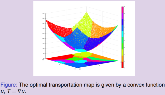 (4)概率论中的Brenier理论和微分几何中的Minkowski-Alexandroff理论等价,从而可以从几何角度来解释概率统计,用几何变分法来求解最优传输映射。