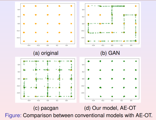 如(a)帧所示,我们设计了平面上的一个概率分布,分布的支撑集显示为橘黄色的点,每一个点代表一个模式(mode)。GAN模型生成的样本用绿色的点来表示。在(b)帧中,GAN模型生成的绿色样本覆盖了一些橘黄色的点,但是依然有一些橘黄色的点没有被覆盖,这就是模式坍塌现象。在(c)帧中,所有橘黄色的点都被pacgan生成的绿色样本覆盖,即pacgan没有出现模式坍塌,但是它也生成了很多绿色样本介于橘黄色的点之间,这就是模式混淆现象。