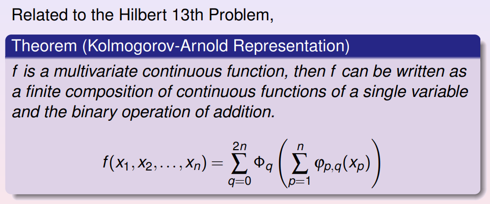 深度神经网络具有万有逼近的性质,即只要给定一个连续映射,给定任意的逼近精度,都存在某个深度神经网络来进行逼近。这个性质的理论基础实际上是来自Hilbert 第13问题:任意一个多变元的连续函数,都可以由两个单变元函的有限复合以任意精度来逼近。我们可以看到深度学习的逼近理论大多是基于这个定理。