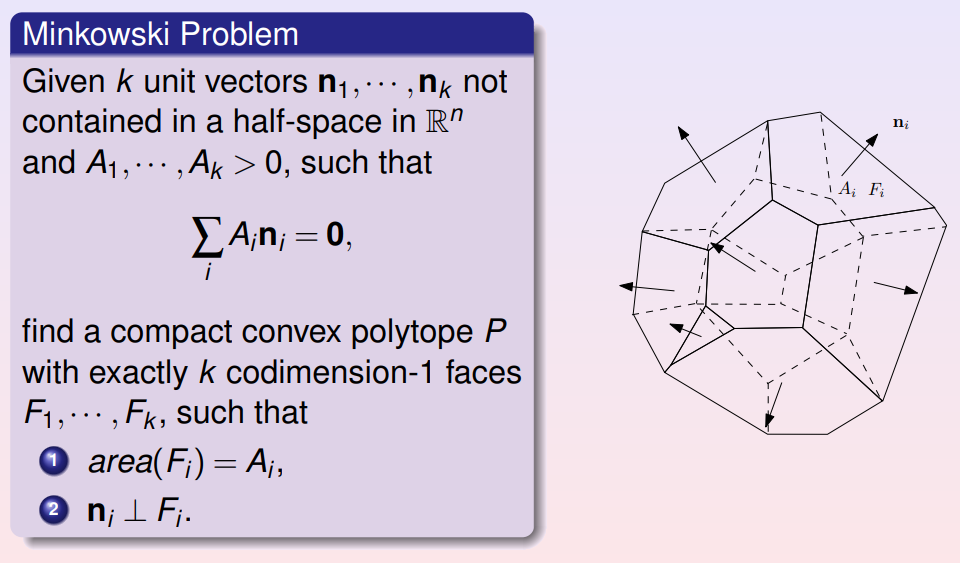 如果在三维空间中给定一个凸多面体,我们知道每个面的面积和法向量(有向面积),并且有向面积总和为0,我们可否将这个凸多面体的形状确定下来?这个问题被称为是Minkowski问题。Minkowski证明了解的存在唯一性。
