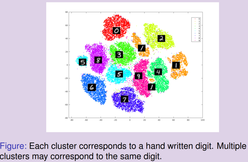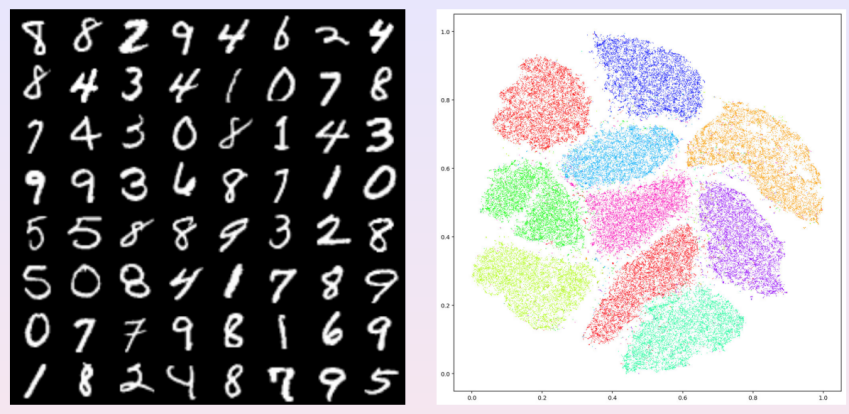 深度学习的第一步就是将这个曲面打到二维平面上,把每一个图像变成一个特征向量,从而实现了降维。手写体数字从0到9共有10个数字,所以其在二维隐空间或者特征空间中有10个团簇。如上图中的右帧,每个团簇用不同的颜色来表示,各自代表一个手写体数字。每个手写体数字代表不同的概率分布,实际上在二维曲面上的分布是不均匀的。