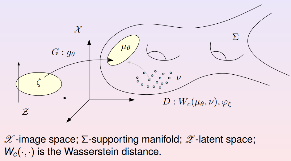 (3)数据流形拓扑结构的学习主要是用万有逼近定理,将流形映射到特征空间(隐空间);概率分布的学习实际是应用最优传输理论。最优传输理论为Wasserstein空间赋予了黎曼度量和协变微分,为在所有概率测度构成的空间中优化提供了理论框架。