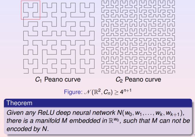 如上图,我们可以递归定义的Peano曲线,每递归一层,其空间复杂度就会乘以4。通过Peano曲线,我们可以构造具有任意复杂度的流形。我们可以用这种流形来检测当前深度神经网络的学习能力。