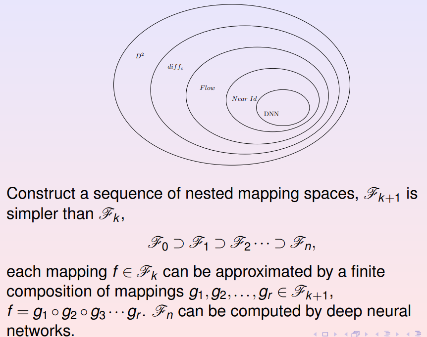 类似的,无穷光滑的微分同胚群中存在一个基于流的子群,即由流速场诱导的变换子群;这个流变换子群存在更小的子群,即靠近恒同变换的子群。如此我们得到一系列嵌套的子群用子群中的有限复合来逼近原来大群中的任何一个元素。而最终的子群足够简单,可以用深度神经网络来精确表达。