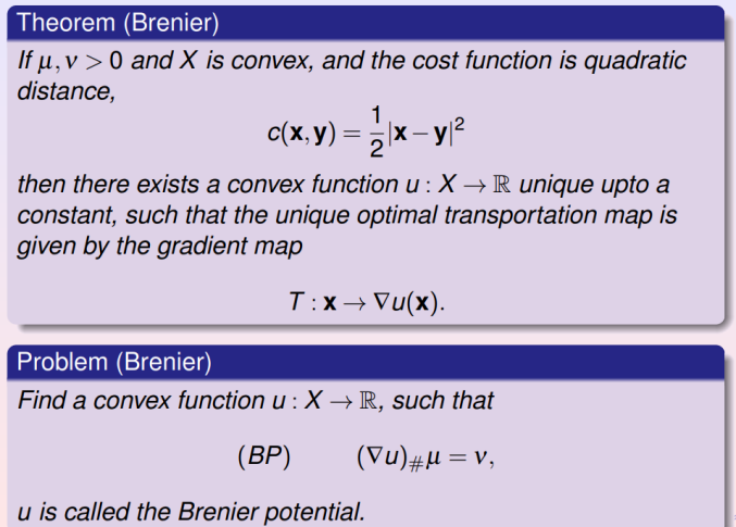 最优传输映射是在所有供需平衡的映射中是的总传输代价最小者。Brenier定理断言:如果传输代价是由从供给方到需求方的欧氏距离平方来界定,那么这个最优方案就会由一个凸函数的梯度给出,这个函数就被称为Brenier势能函数,且满足知名的Monge-Ampere方程。