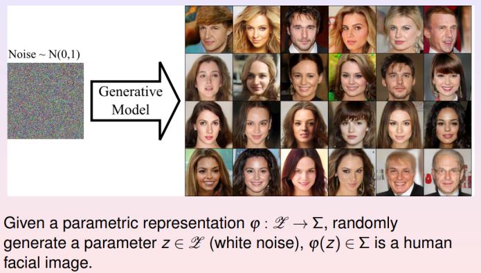 我们在特征空间生成一个白噪声,均匀分布或者高斯分布,然后将其变换成特征空间中的数据分布。这样我们可以在特征空间产生随机采样点,其分布符合数据分布,在将隐空间的随机采样带映射回数据流形上,得到数据流形上的一个采样点,即为随机生成的人脸图像。