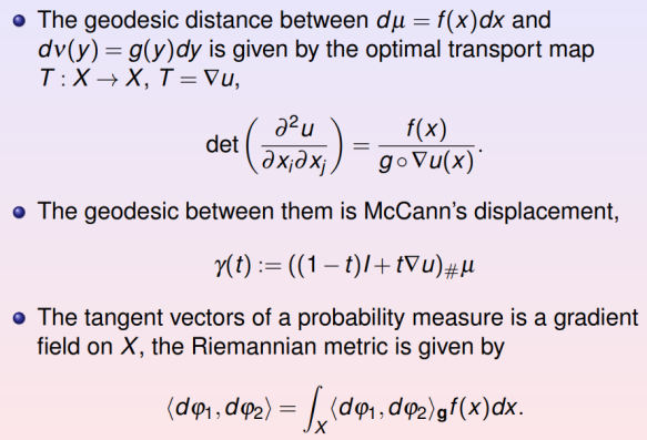 给定两个概率分布,它们之间的最优传输映射由蒙日-安培方程所控制,两个分布之间的测地线有McCann平移给出,Wasserstein空间某点处的切向量是底流形上的梯度场,其梯度场内积的加权积分定义了Wasserstein空间的黎曼度量。