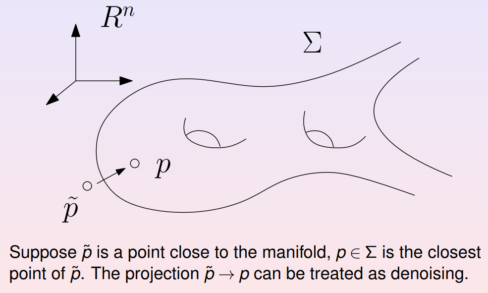 我们用深度神经网络的万有逼近能力来数据流形的拓扑结构,接下来学习概率分布,从而把白噪声转换成数据的概率分布。
