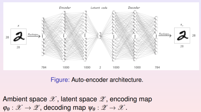 这里我们考察最简单的编码解码网络:自动编码器。以刚刚我们提到的手写体数字识别为例,编码器的输入样本是28*28的手写体图像,输出是复制的相同图像,损失函数是使生成图像与输入图像的距离。我们设计两个对称的网络,前面网络是编码器,后面网络是解码器,中间的瓶颈层代表了隐空间,瓶颈层节点的个数是隐空间的维数。前面网络将输入图像从784维降维两维,实际上相当于一个编码映射,后面网络从两维变回784维,相当于解码映射。训练的目的是得到恒同变换,即编码映射和解码映射彼此互逆,由此编码和解码映射是从数据流形到特征空间的拓扑同胚。