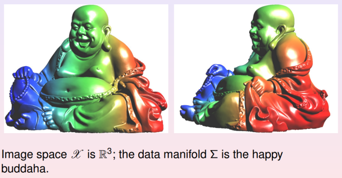 如图所示,假设二维弥勒佛曲面嵌入在三维欧氏空间之中,曲面上存在一个均匀分布。对于深度学习而言,第一步就要实现降维,计算由三维曲面到二维平面的映射。