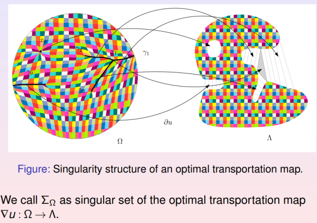 模式坍塌现象的本质原因来自于最优传输映射的正则性理论。在经典的蒙日-安培方程理论中,人们研究最优传输映射大多是比较规则的情形,假设密度函数上下有界,支集是边界光滑的凸集,由此我们能够证明解的光滑性。但是如果目标区域非凸,则解可能非光滑,存在奇异集合。例如上届菲尔兹奖得主Figalli给出下面的例子: