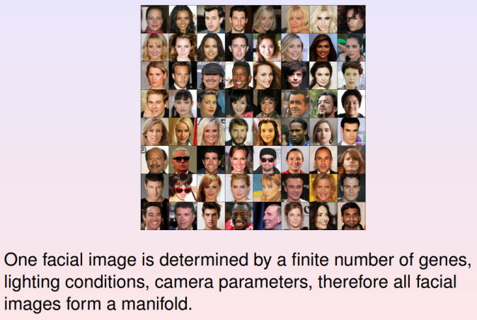 在工程实践中,我们经常要生成许多人脸图像。这里对应的概念就是人脸图像,每张图像包含上百万像素,因此图像空间维数很高。在图像空间中的每个点代表一幅图片,所有人脸图像构成点云,即弯曲的数据流形。经过大幅度的降维,我们将人脸图像数据流形映射到隐空间上,不同类型的人脸表示成流形上不同的概率分布,深度生成模型的核心就是学习人脸图像的概率分布。