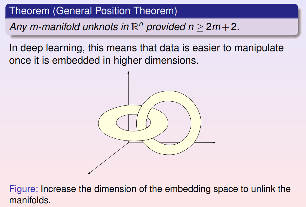 考虑流形在欧氏空间中的嵌入,一般位置定理断言如果欧氏空间的维数足够高,那么流形的嵌入可以将扭结打开使其不再自我嵌套。因此,在深度网络模型中,前面几层的宽度逐步增加,从而提高嵌入空间的维数。