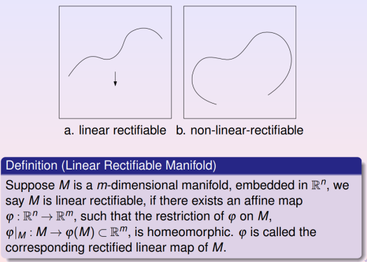如何表示学习一个流形的难度呢?观测上图左侧曲线,我们可以将其向平面进行投影,映射到一条直线段上,并且这个投影是同胚;而右侧曲线无论向任何方向投影都无法同胚映射到直线段上,我们必须将曲线分成几段,每段分别双射投影到直线段上。一般情形下,我们需要对流形分片,每片同胚投影到线性空间,所有分解方法中片数的下限定义了流形的复杂度。
