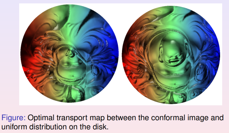 基于我们的定理,我们可以设计算法求解最优传输映射。黎曼映射将弥勒佛曲面映射到平面单位圆盘上,从而将曲面的面元前推到圆盘上,得到黎曼映射诱导的测度。我们计算从圆盘上的勒贝格测度到黎曼映射诱导的测度之间的最优传输映射,左帧显示了相应的Brenier势能函数;其逆映射也是最优传输映射,其Brenier势能函数显示在右帧,两个势能函数互为勒让德变换。