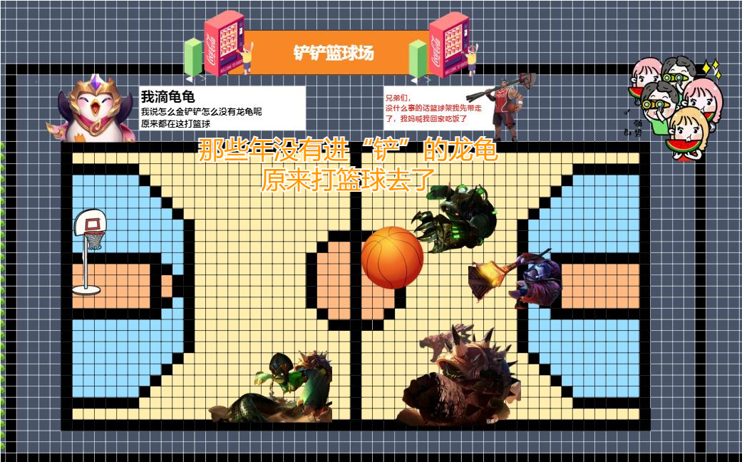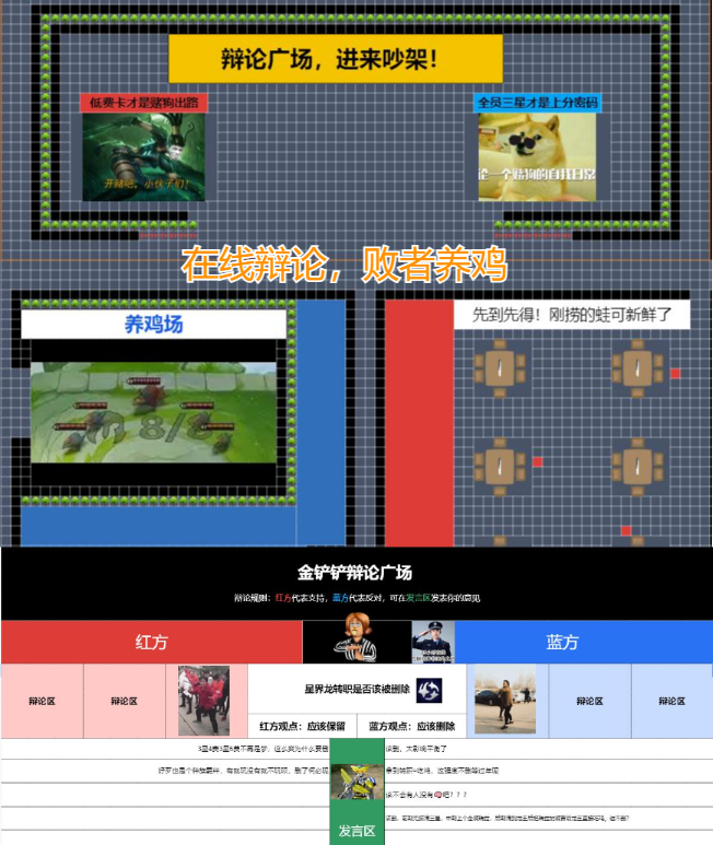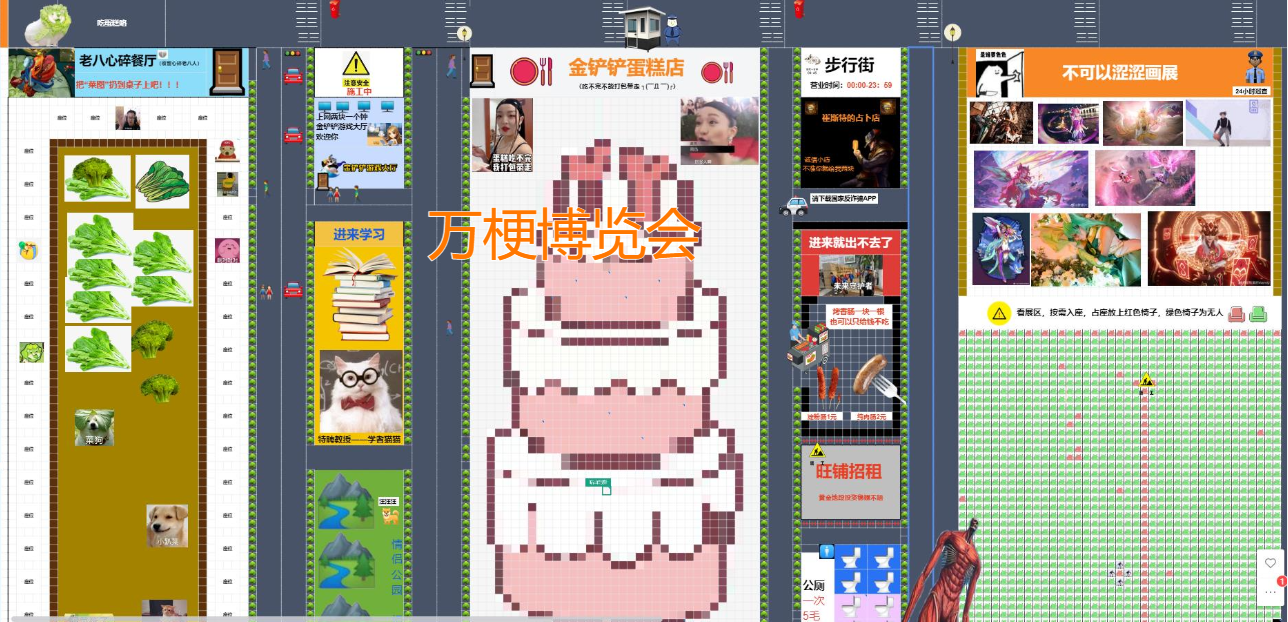 首先是应有尽有的弈周年主广场,老八心碎餐厅、日常天谴局型选手们的深夜emo馆、被龙龟吧占领的金铲铲篮球场、蛙妃鸡哥养殖场......想得到想不到的这里都能看到。而且作为在线文档,它还保留了原本的功能,每个区域都有可以自由发言的格子,“人声鼎沸”的祝福和吐槽区,再配上杂乱无章但格外熟悉的小吃、地摊和展馆布局,意外地能让人从一份在线文档中感受到逛庙会时的烟火气。