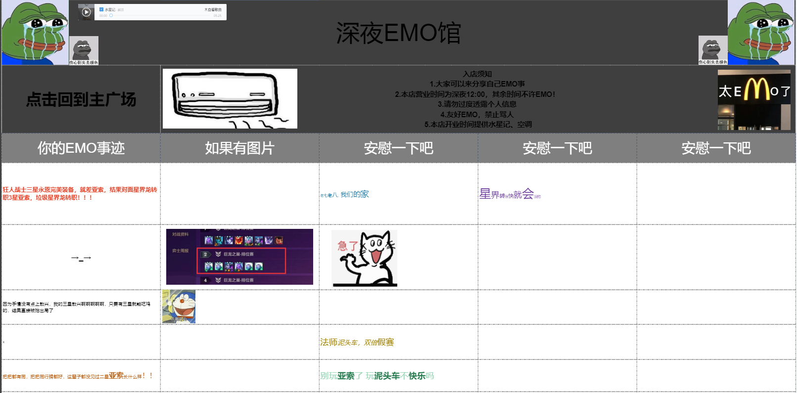 深夜emo馆,有些游戏里的糗事闷在心里只会越像越气,但是分享出去或许就会慢慢变成一段趣谈,毕竟emo是一时的,但是各不相同的“悲惨”故事留给吃瓜网友们的欢乐是永久的,有不少不愿意透露姓名的铲人就留下了诸如索拉卡八等一,赛芬永远假赛的,亚索永远不二星的悲伤往事博君一笑;