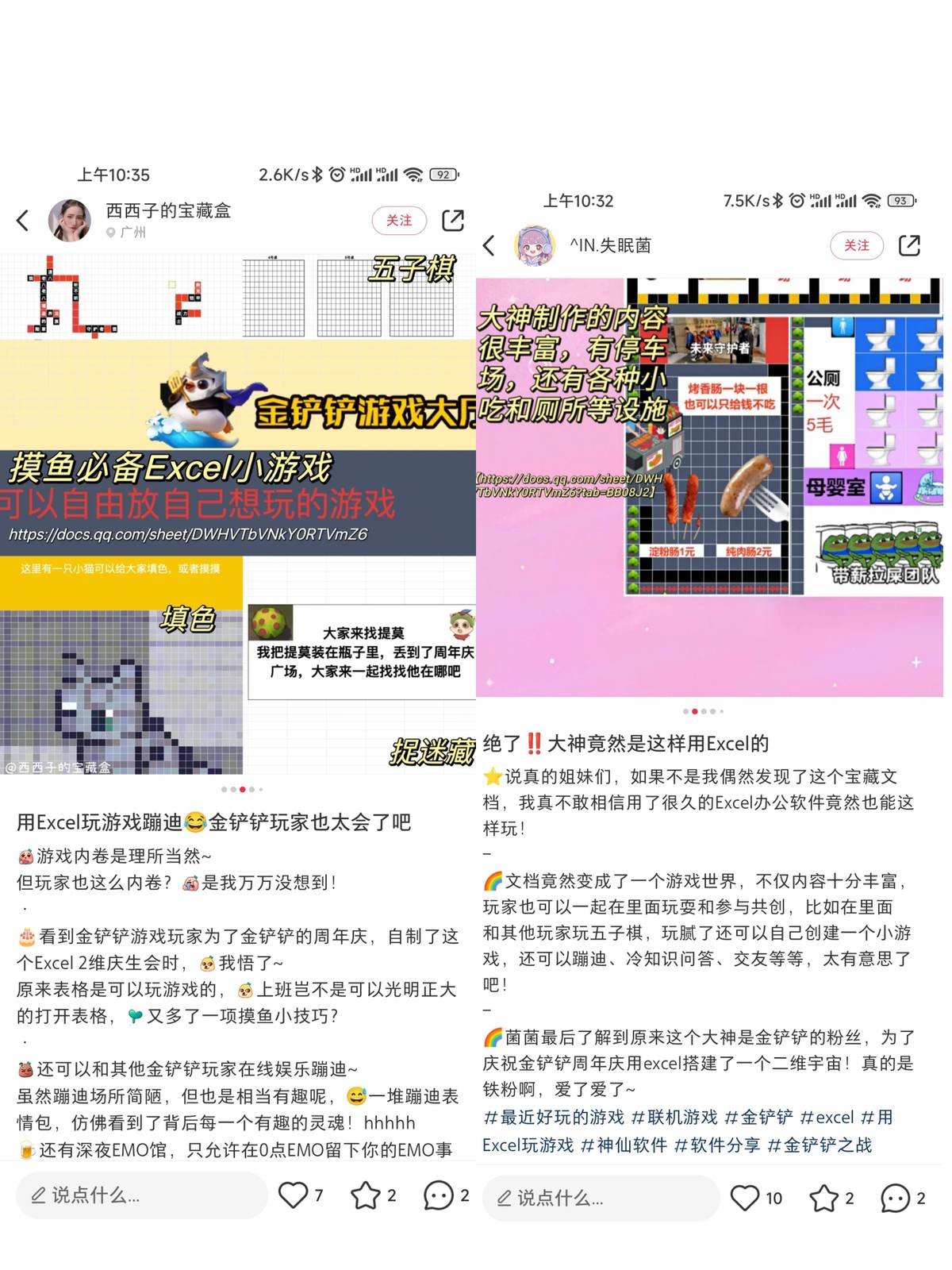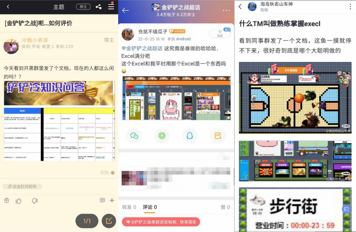 有趣的是,文档甫一上线甚至不需要宣传,就已经自然而然地在玩家群体中传播开来。可以看到各大社交平台上都陆陆续续出现了不少关于这个二维宇宙的讨论声,有为文档制作者点赞的路人玩家,有在表格里到处划水凑热闹的吃瓜群众,也有在辩论区认真讨论的深度金铲铲选手。一时之间,这个在线文档不仅得到了大量玩家的认可,更是随着一部分勤勤恳恳的“打工人”的无意进入,各种无厘头的评论和随心所欲的玩梗的出现,一跃成为大家可以短暂放松的“摸鱼宝地”。