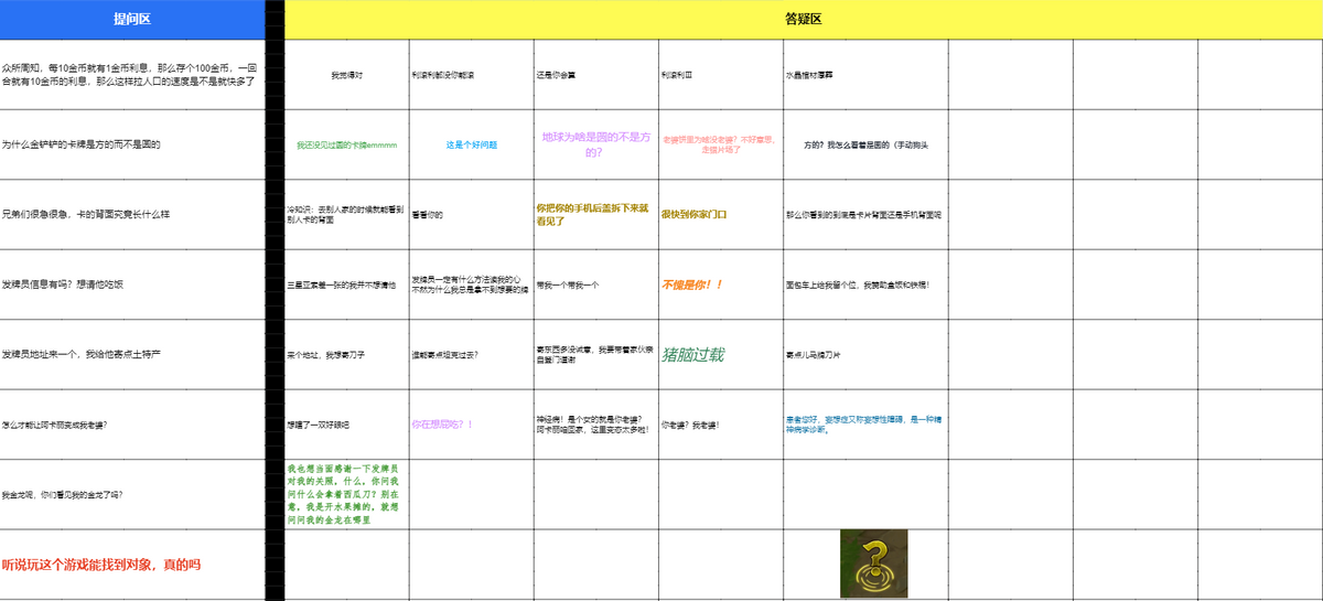而诸如十六连败老八出门、求狼又求鸡、赌狗末日、万物皆龙龟等游戏内耳熟能详的名场面跟现实中花生瓜子矿泉水、疯狂星期四、国家反诈骗APP等老梗天马行空般交织在一份“平平无奇”的在线文档中时,这样的反差很难不让人会心一笑。