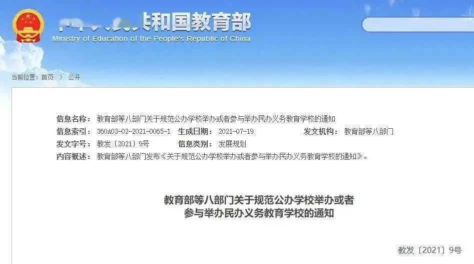 2021年7月,教育部等八部门下发《关于规范公办学校举办或者参与举办民办义务教育学校的通知》(下称《通知》),提出全国义务教育阶段“公参民”学校要么转为公办,要么转为纯民办,要么终止办学,而转为民办的学校不得继续使用公办学校校名或校名简称。