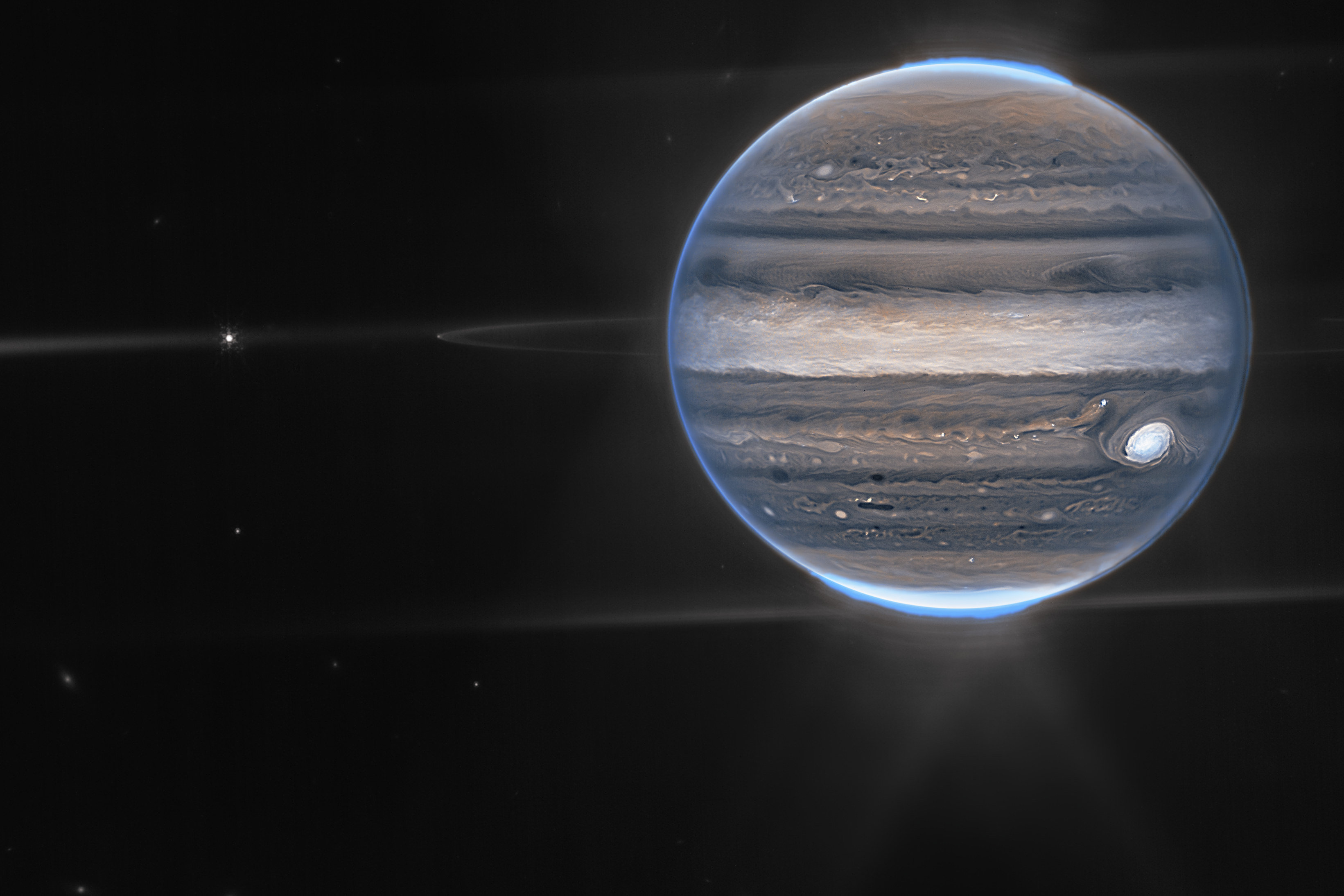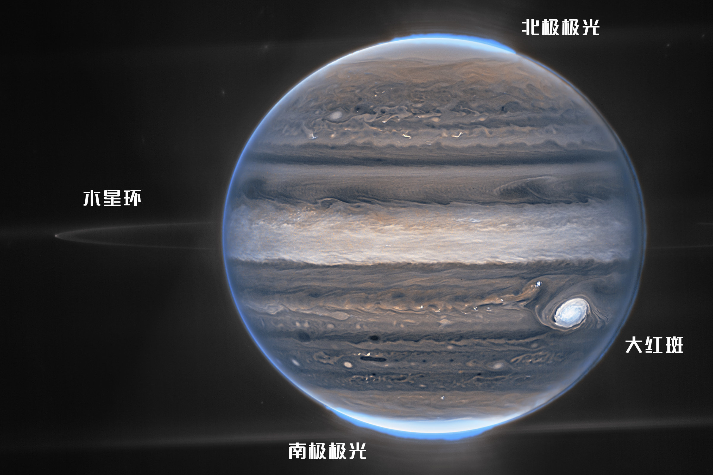 除了木星环,照片另一个引人注目的地方就是环绕在木星圆面上的一圈幽幽蓝光,我一开始以为这一圈蓝光都是是木星上的极光。木星极光是木星磁场偏转了来自太阳的带电粒子流(太阳风)后轰击木星高层大气产生的辉光。但实际上,拥有超强磁场的木星是不太可能有全球性的极光的。跟地球一样,位于南北极附近的才是极光。至于木星边缘那一圈蓝光是什么?NASA没说……我猜是木星大气散射的红外波段太阳光。