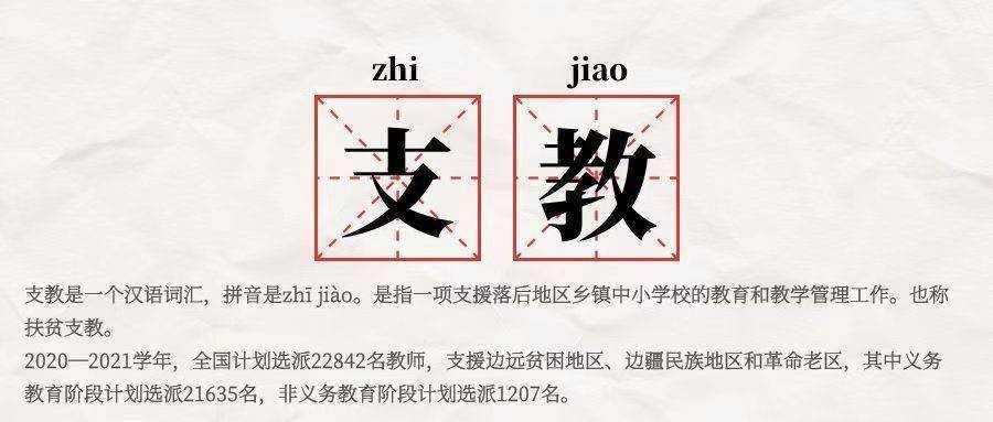 支教:支教是一个汉语词汇,拼音是zhī jiāo。是指一项支援落后地区乡镇中小学校的教育和教学管理工作,也称扶贫支教。