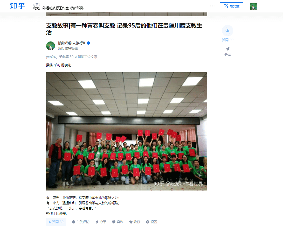 从川藏结束支教后,自由撰稿人杨晓龙并没有选择进入一家单位或企业工作,而是又一次完成他在支教期间为自己定的目标:自由撰稿人。如今除了自由撰稿人,他还是一名户外旅行摄影师兼领队,也一直在利用新网络和新媒体宣传支教,在网络回答分享宣传支教领域的话题,传播正能量。在这个期间,也有很多支教老师通过看他撰写文章,追随他的脚步,前去西藏,新疆,内蒙古,四川和云南等地进行支教,这也是杨晓龙坚持利用互联网宣传支教的动力。