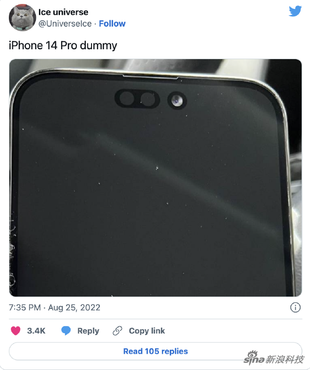 随着发布会的临近,网上也出现了一些有关药丸屏的爆料,@Ice Universe 在Twitter分享了一张iPhone 14 Pro的正面机模。在图像中,可以看到“药丸 + 挖孔”比之前的刘海更偏下一些。