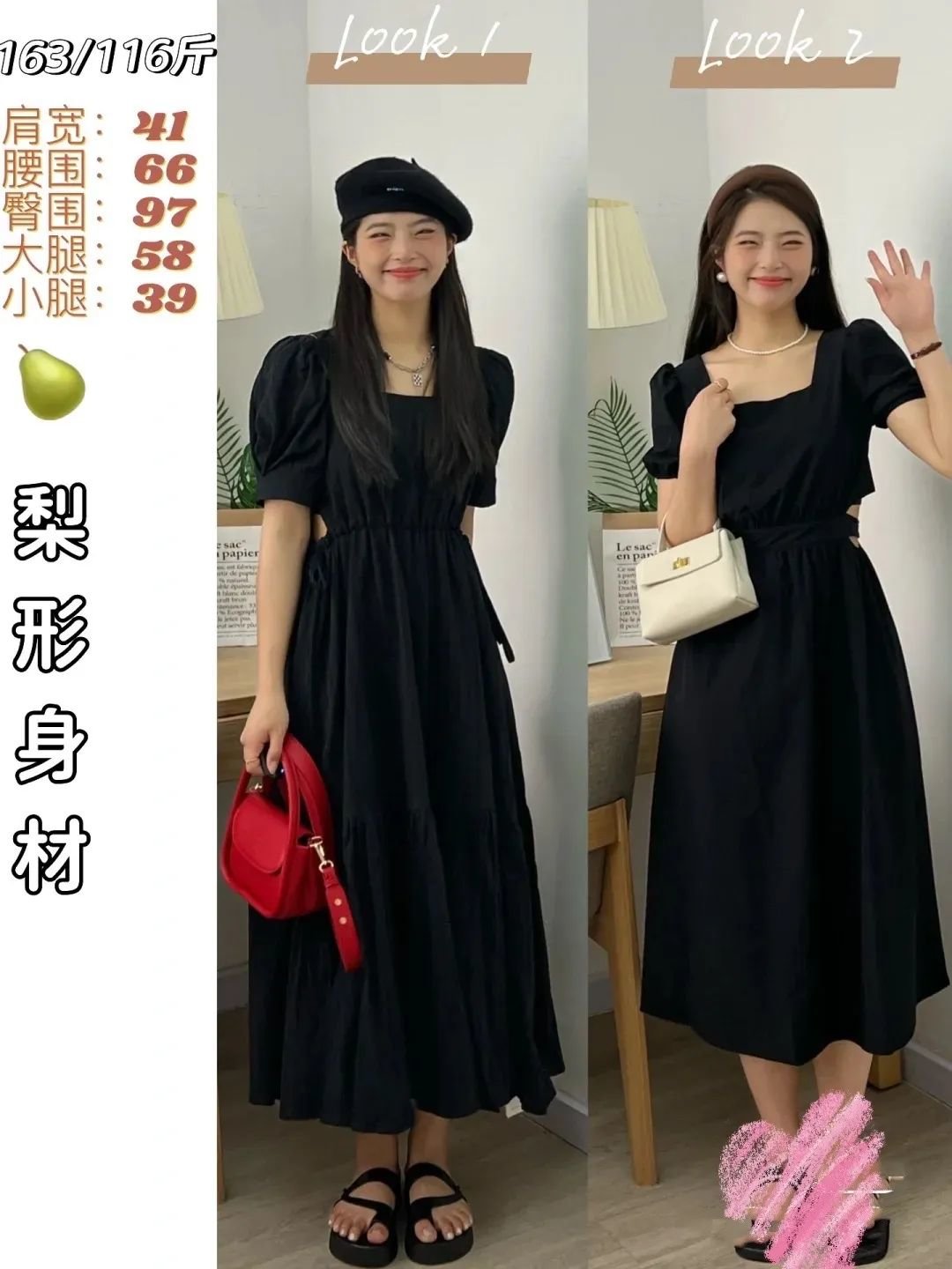 一条经典的小黑裙,其实也是暗藏心机的呀。对于微胖的小个子姑娘特别友好,高腰线的剪裁拉长下身的比例。泡泡袖的造型特别遮肉,腰间利用了小心机的镂空,真的显瘦又时髦呀。