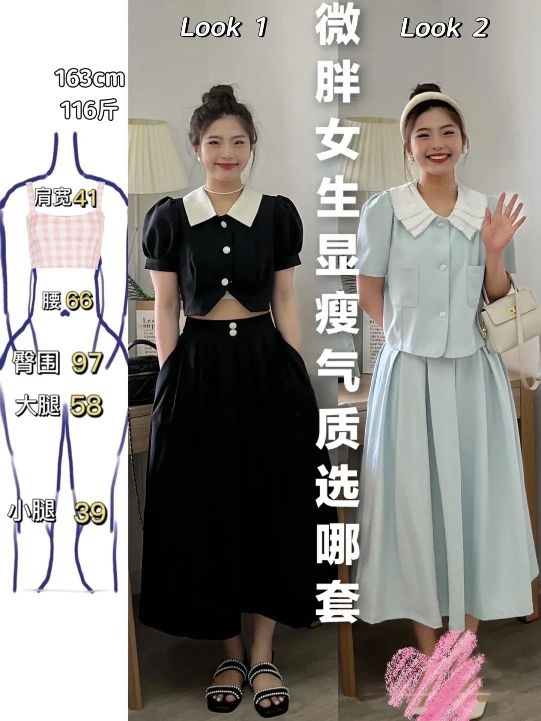 甜美一点的风格,更加适合微胖的姑娘呀。身材微胖的姑娘,本就有着甜美的娃娃脸,穿上可可爱爱的套裙,更是甜美时髦了起来。露腰的小套裙,搭配了娃娃领的装饰,更加的清新可爱。