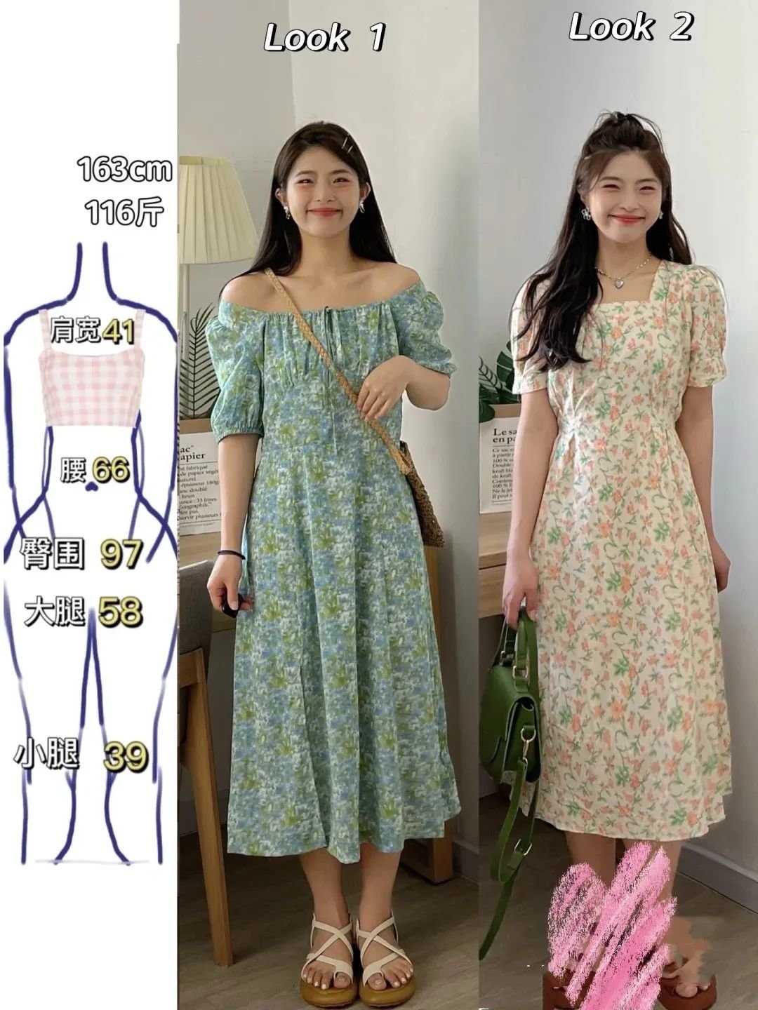 同样是两条碎花的连衣裙,一字肩的穿法就更加时髦俏皮一些呀,也可以显得穿着者身材更加小巧精致一些。掩盖大骨架的同时,增加身体的玲珑感。