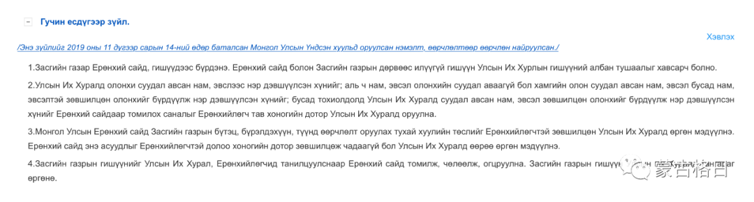 此次被审议通过的《蒙古国宪法(修订案)》,主要是将《宪法》第39条第一款中规定的:关于“政府总理从国家大呼拉尔议员中产生,总理和不超过4名政府内阁成员可兼任国家大呼拉尔议员” 的相关内容,作出了删减。
