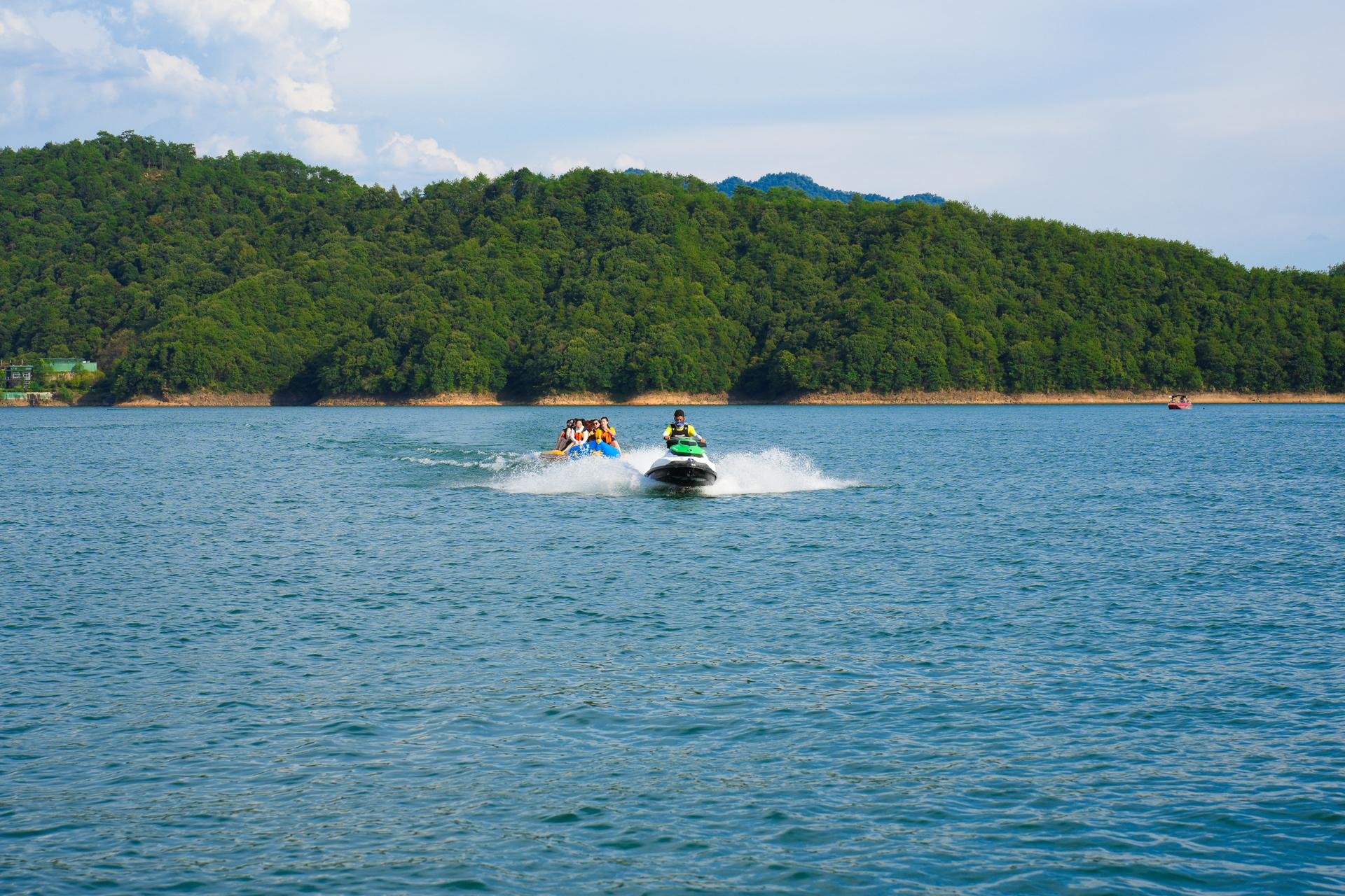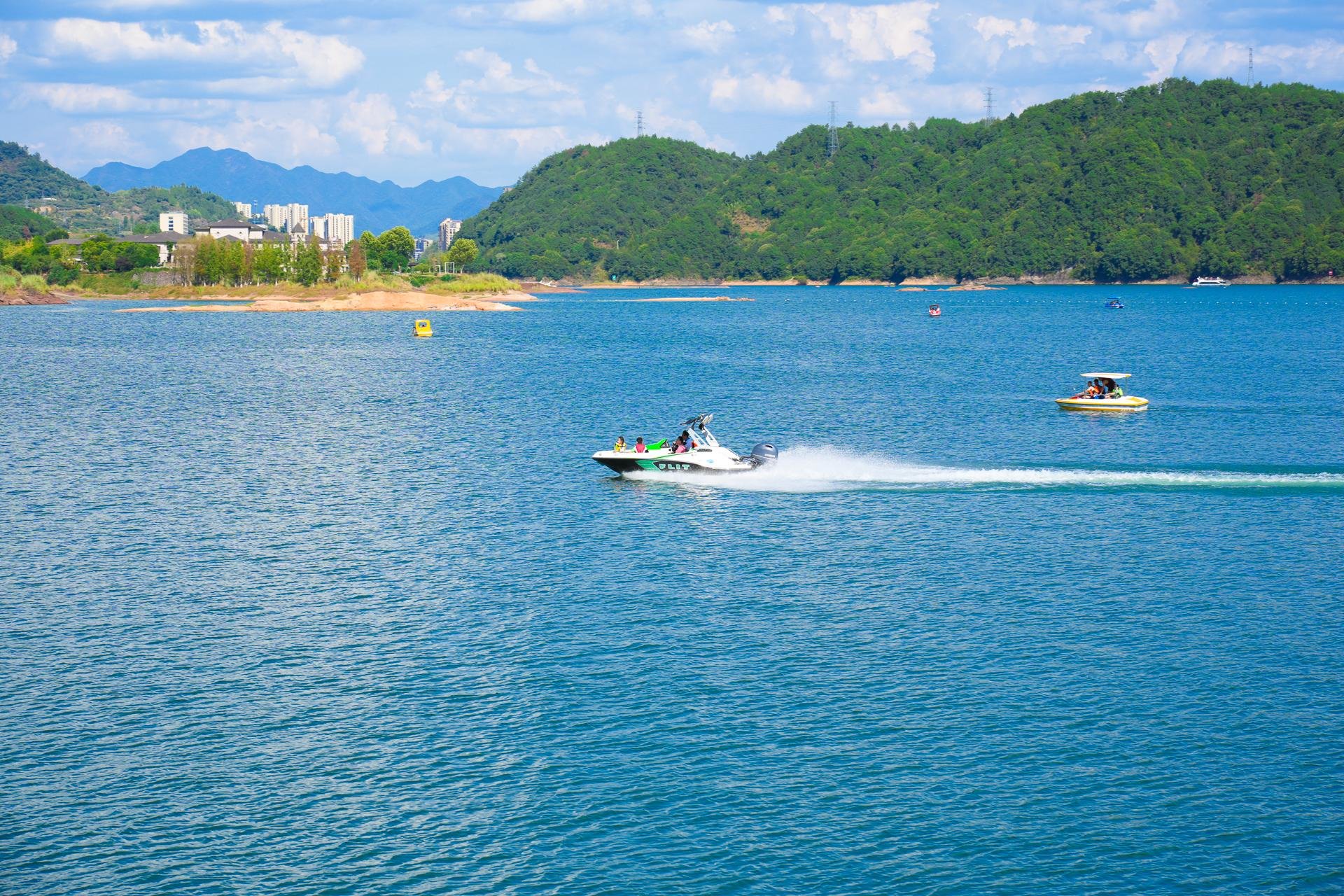 水上摩托艇,在青绿色的千岛湖水中,感觉水上的速度与激情。水上自行车,一项老少皆宜的休闲体验项目,家庭出游,情侣出游最佳选择。