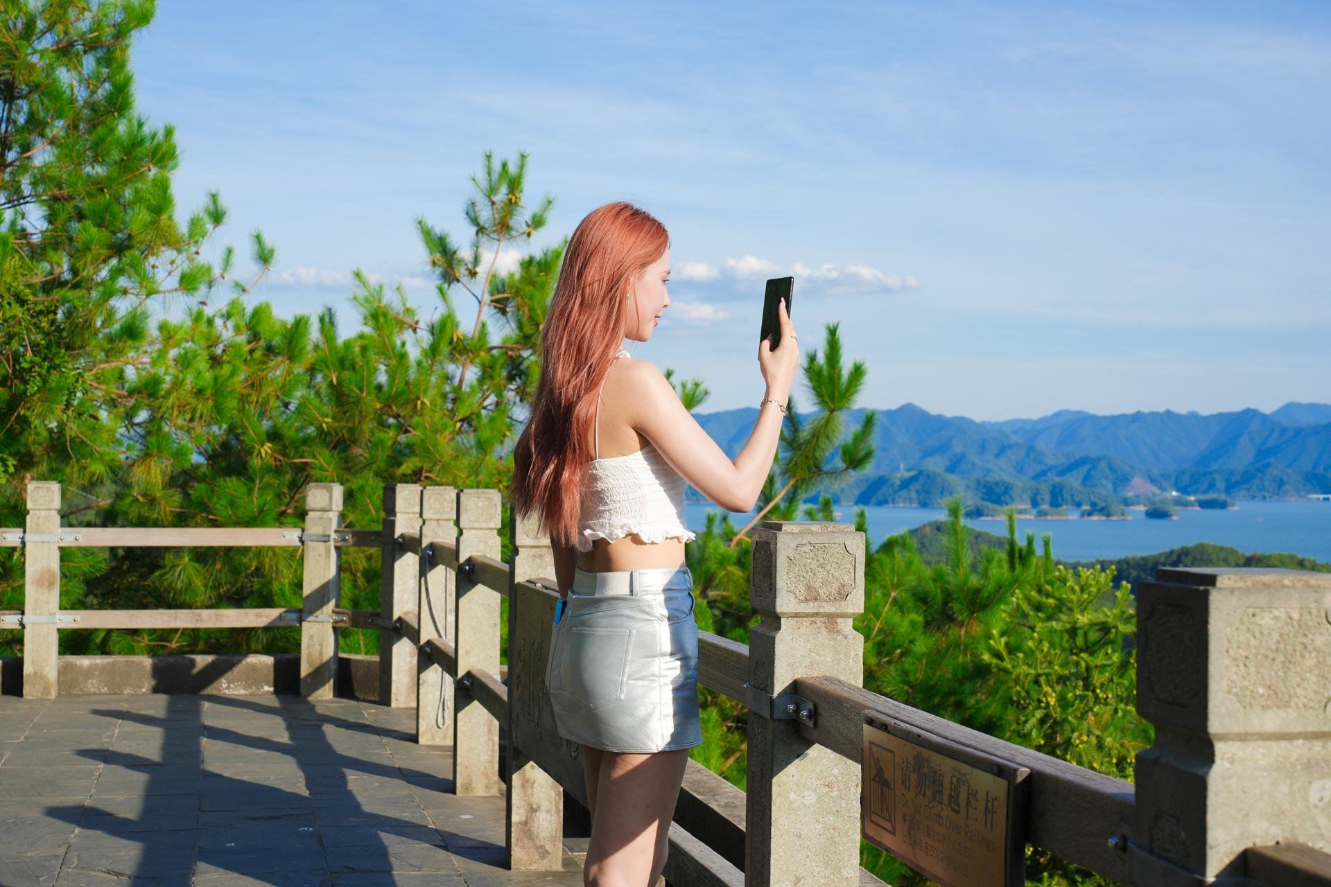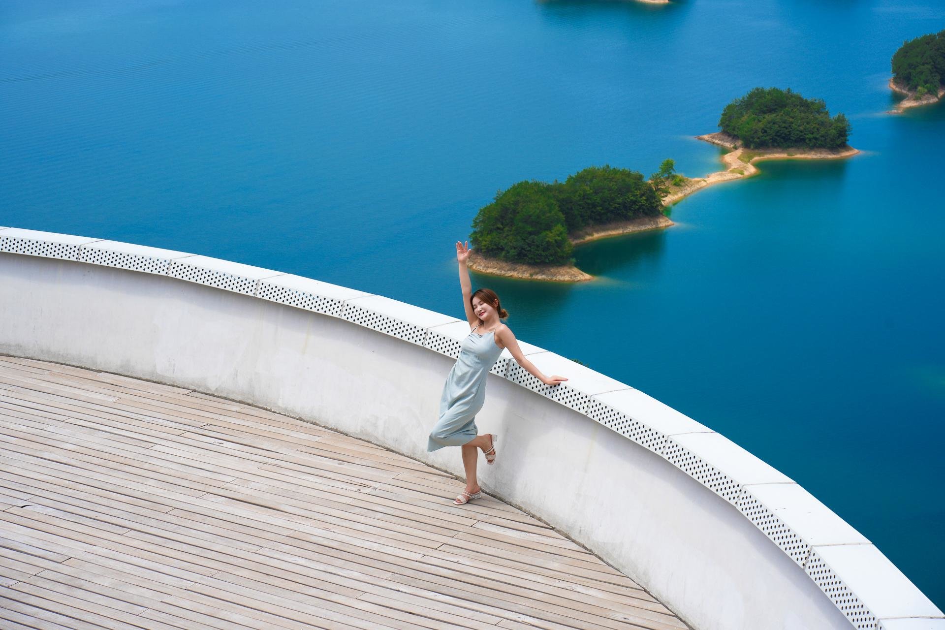 登上千岛湖黄山尖最高一层观景台,放眼望去,群山连绵林海叠翠,山风徐来松涛呼啸,登上山顶而远眺千峰竞秀万壑滴翠,高峡平湖绿水如镜波光潋鱼跃湖面鹰翔于天,苍穹如碧浮云虚幻。清风徐徐荡涤俗念,薄云柔夷轻拂身心。一湖碧水映蓝天之笑,九洲灵韵聚千黛。掬水月在手,染花香满衣,在这里我感触到了令人怦然心动的美。