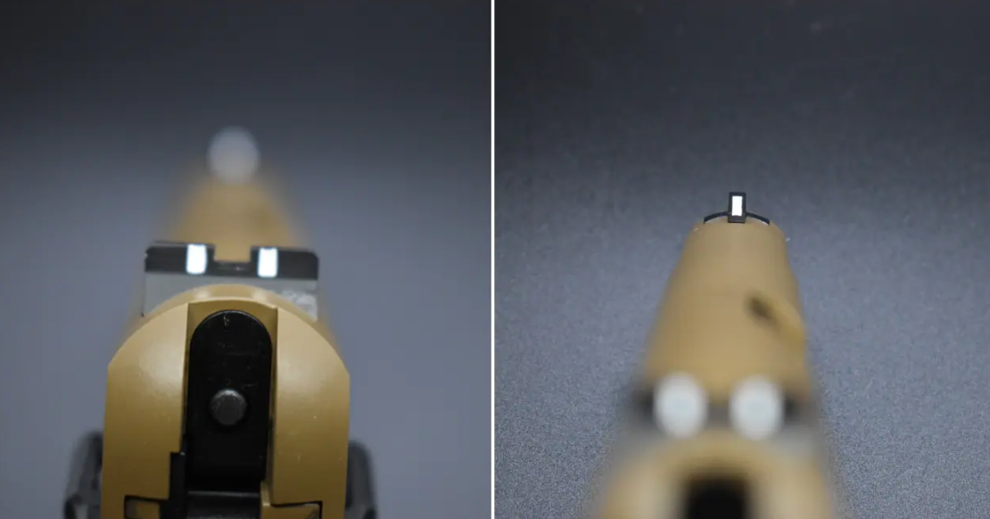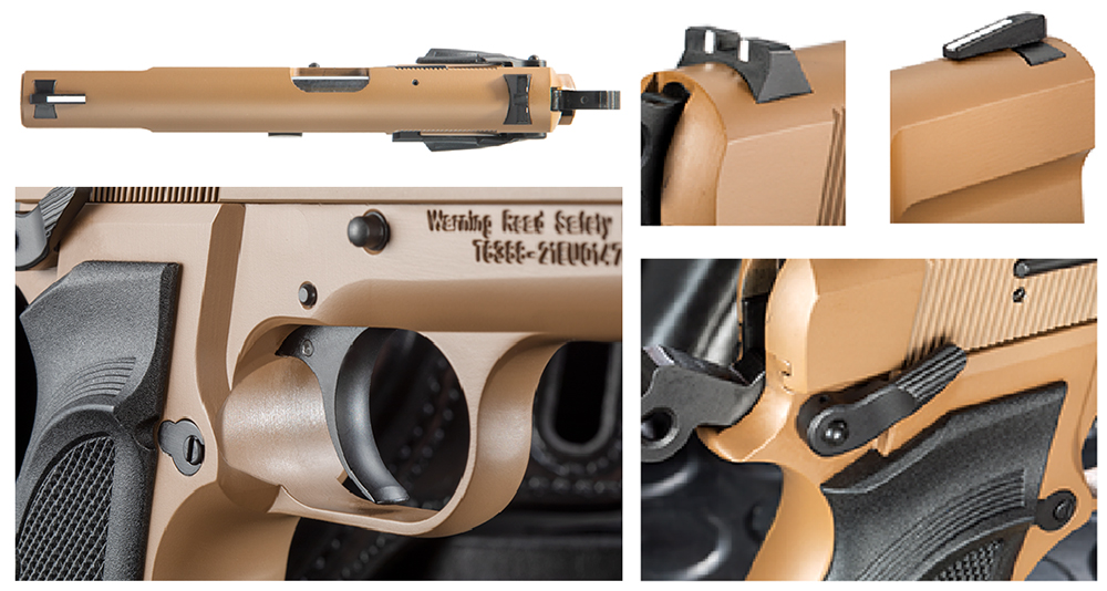 这把枪的准星照门并没有复刻当年勃朗宁HP的准星照门,准星照门上都涂了白色,更便于瞄准,当然,这个准星照门可以更换,换成光纤的。另外击锤换成了环装击锤,而不是勃朗宁HP后来的直刺锤,原因是原来的击锤总容易划伤手。另外弹匣换成了 意大利Mec-Gar 生产的 15 发齐平弹匣,比原版的勃朗宁HP多了两发。