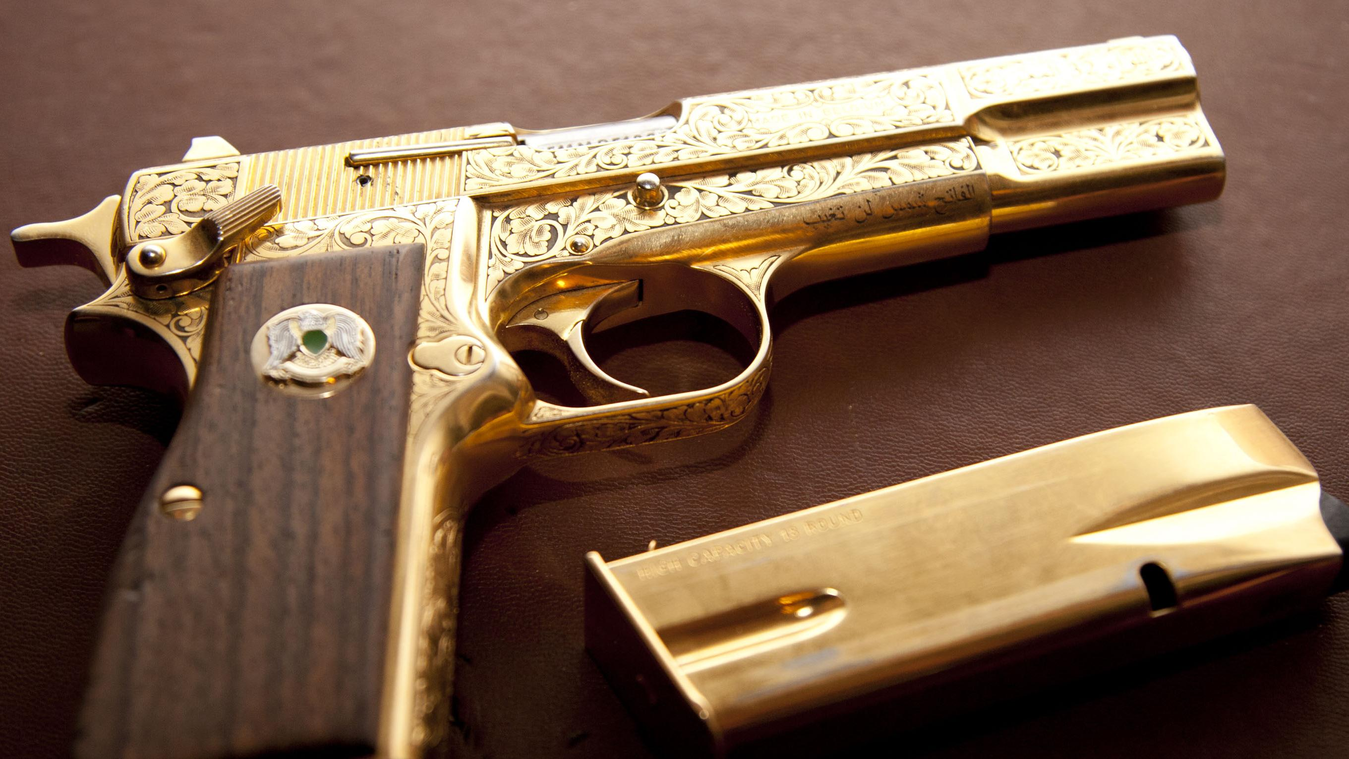 利比亚大独裁者卡扎菲的金色手枪,是勃朗宁大威力手枪。勃朗宁大威力手枪的英文名是Hi Power,直译就是大威力手枪。