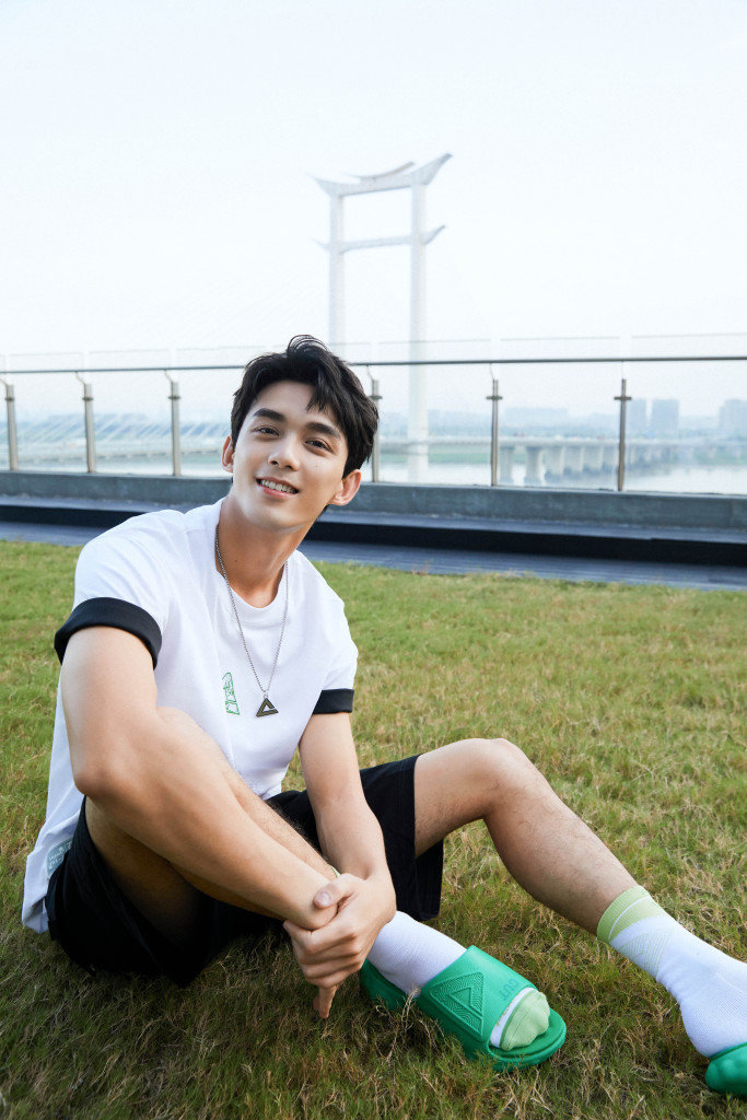 2022年8月27日,吴磊泉州为运动品牌匹克代言,身穿白T恤运动造型拍摄户外写真。