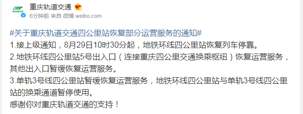 今(29)日,重庆轨道交通发布消息,8月29日10时30分起,轨道交通四公里站恢复部分运营服务,具体如下: