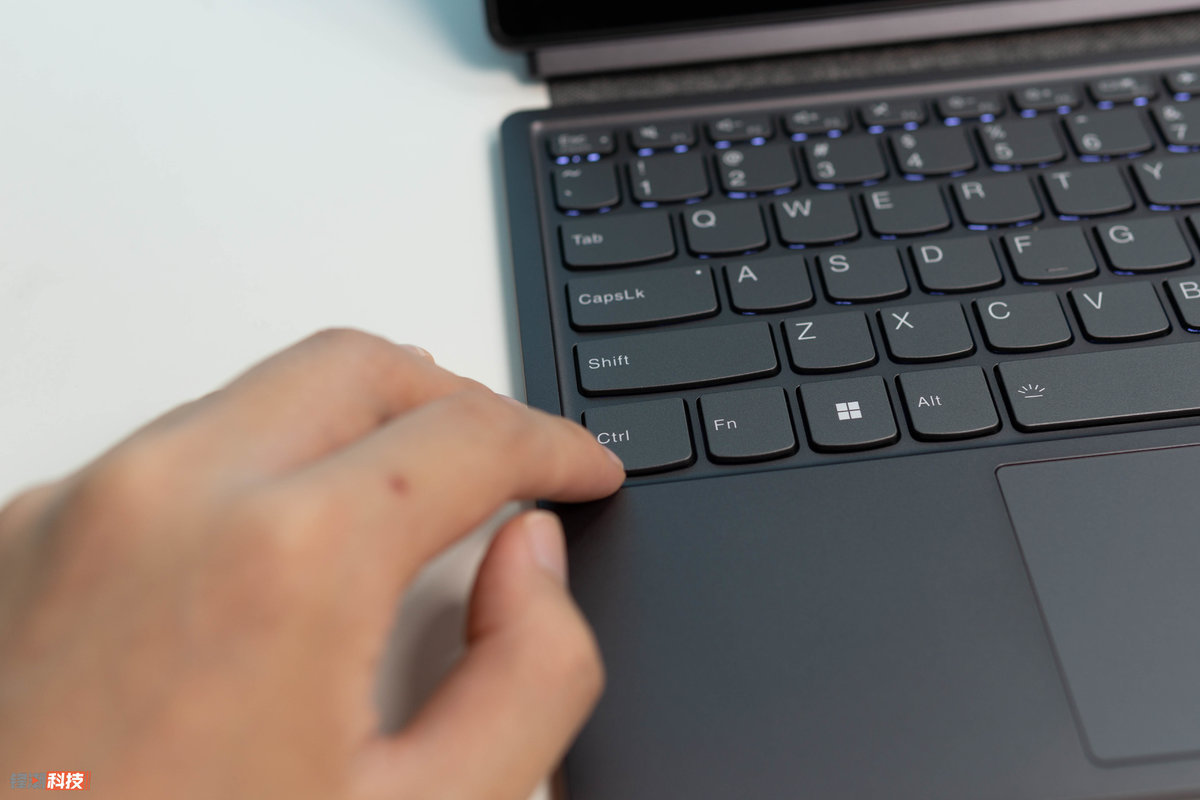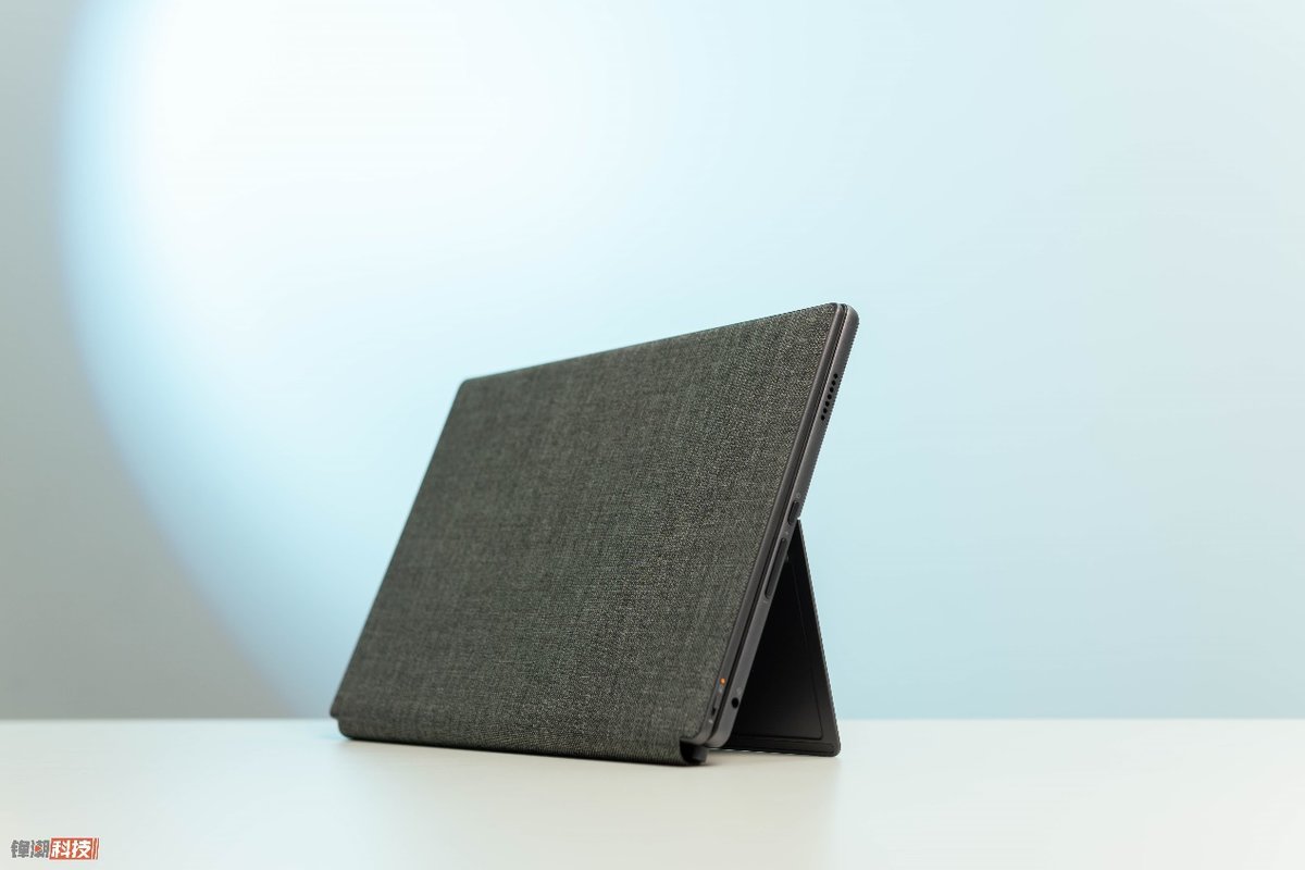 另外,想让小新 Duet 变身“笔记本”,就需要给它接上随机附带的键盘盖了。键盘盖在背面采用了织物布面材质,正面的按键键程尚且不错,按键也接近全尺寸,还支持背光与分体使用的蓝牙,整体的输入体验还是不错的。