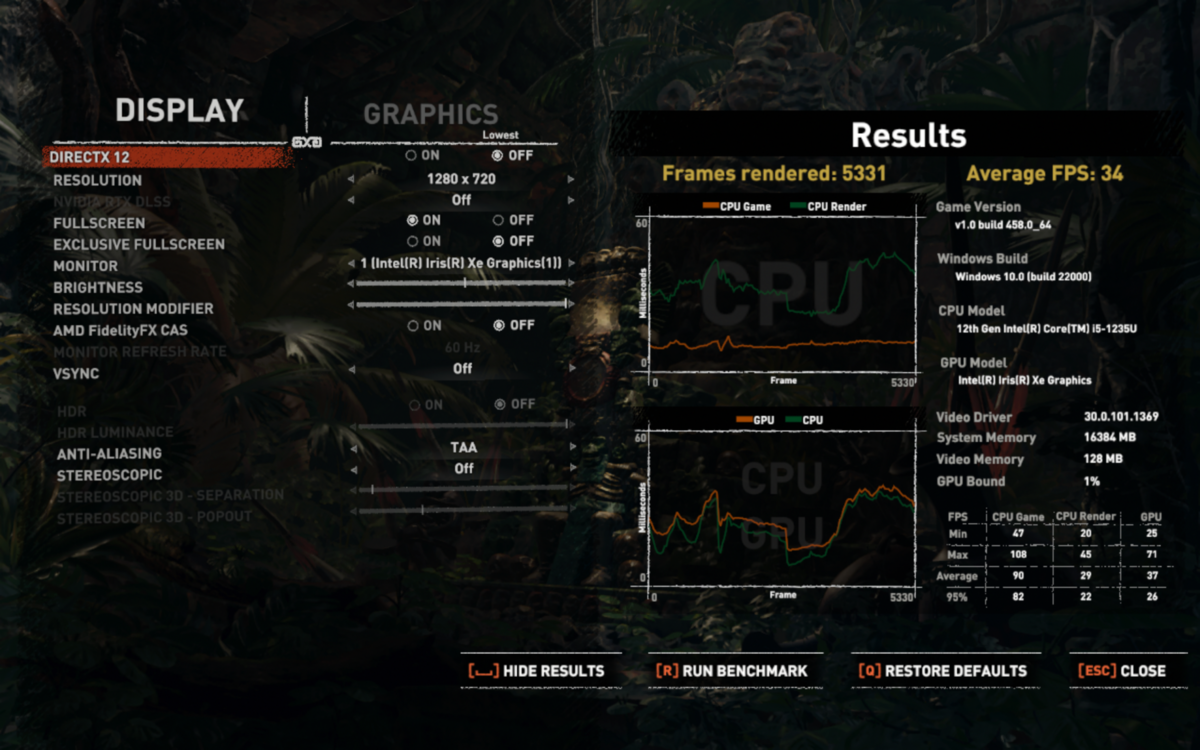 此外,我们还拿它进行了一些比较简单的游戏测试,在《古墓丽影:暗影》的测试里,1080P 默认画质能达到 28 帧的平均帧率,而 720P 默认画质下则会达到 34 帧的平均帧率,属于“再调低点勉强能玩”的水准,对于小新 Duet 这样的二合一形态来说,其实已经很出色了。