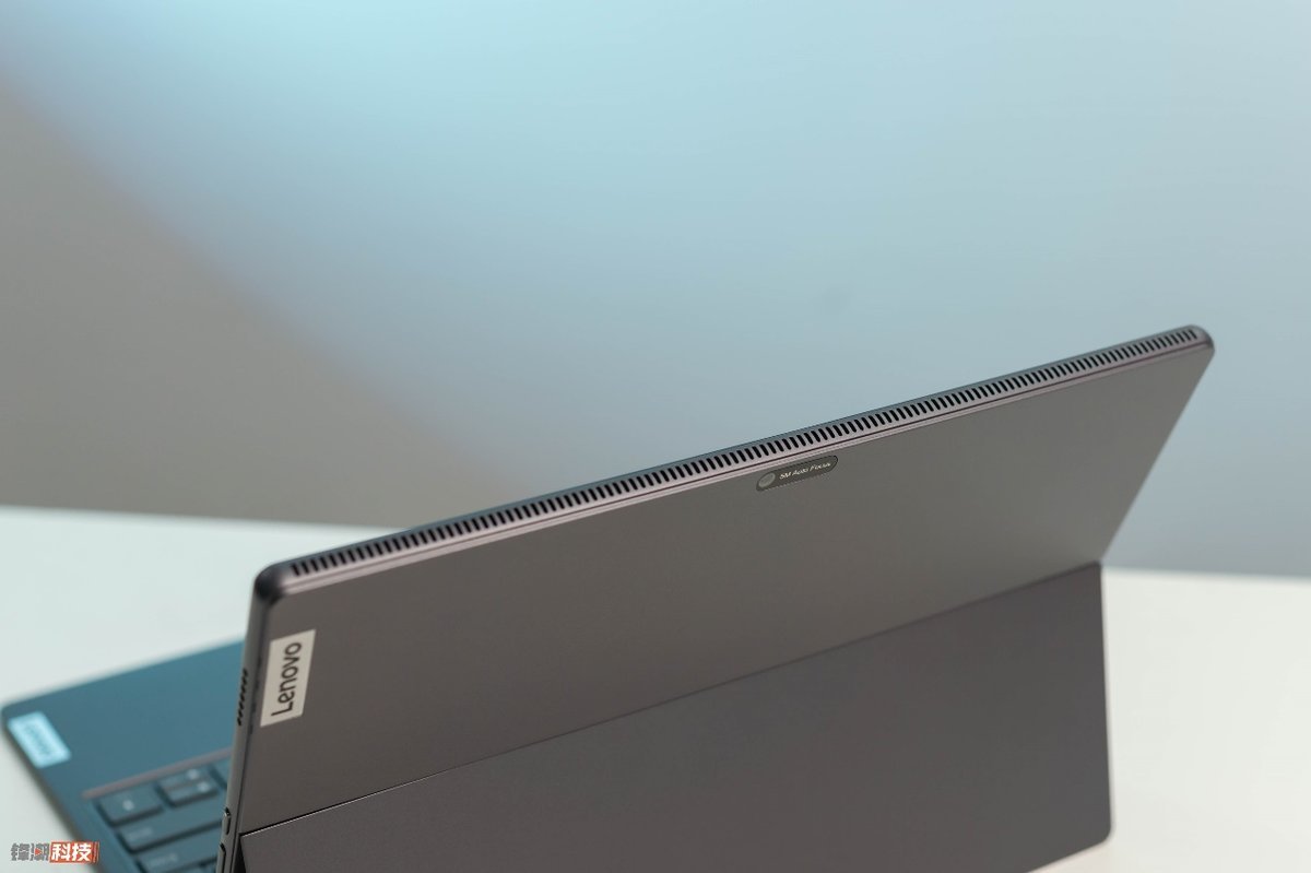 不过我们还是需要注意到两点,第一是小新 Duet 毕竟是比较注重性价比的产品,第二则是它对性能释放还抱有一定的执念。这两点让它在机身设计上会显得稍微有些“粗犷”,机身的上方是一整排的散热孔,在平板模式下使用时,握持手感或许会并不是那么尽如人意——当然,我也并不建议你以平板模式去使用它。